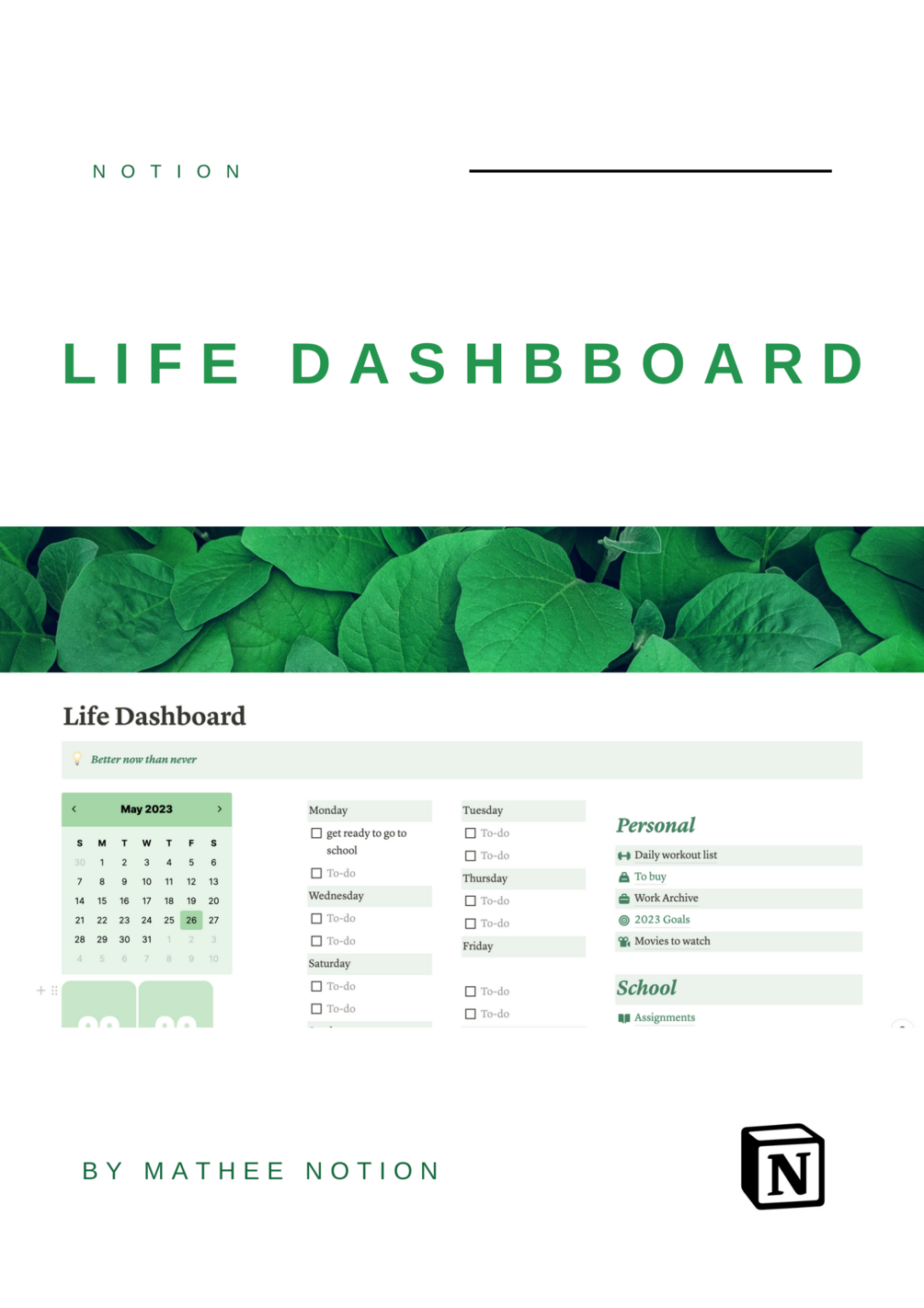 Life Dashboard Notion template is beneficial because it allows you to comprehensively organise and manage various aspects of their lives in a centralised and visual manner. By utilizing a life dashboard, you can track your personal and professional goals, manage tasks and projects, monitor their health and wellness, track habits and routines, and maintain an overview of important dates and events. This holistic view enables better time management, improved productivity, and a greater sense of control and balance in your life.